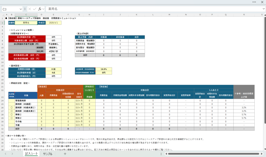 令和8年(2026年)6月施行の調剤報酬改定では、物価高騰・賃上げ対策として「調剤ベースアップ評価料」が新設されます。本ツールは、この新設加算による月間の原資配分をシミュレーションし、職員の賃上げ計画を具体的に策定するためのExcel完結ツールです。